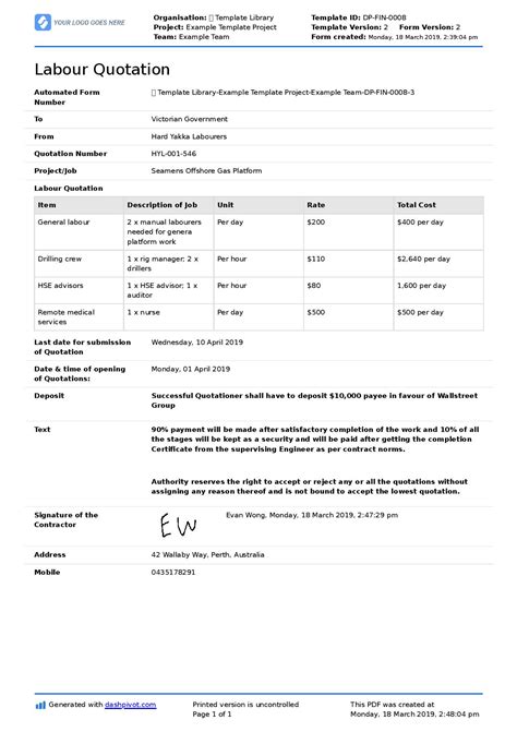 Labour Quotation - Instantly download labor quotation template, sample & example in microsoft word (doc), google docs, apple pages format. Here is labour quotation format for creating labour price quotes that make great first impression. Businesses can use this labour quotation. Use a digital system like dashpivot to customise, manage, and share. Download and edit this template to create professional and persuasive quotations.